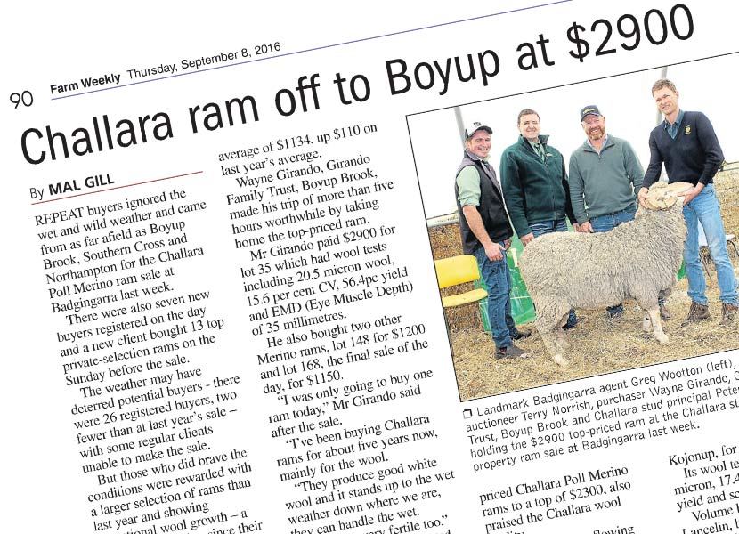 REPEAT buyers ignored the wet and wild weather and came from as far afield as Boyup Brook, Southern Cross and Northampton for the Challara Poll Merino ram sale at Badgingarra last week. There were also seven new buyers registered on the day and a new client bought 13 top private-selection rams on the Sunday before the sale. The weather may have deterred potential buyers – there were 26 registered buyers, two fewer than at last year’s sale –with some regular clients unable to make the sale. But those who did brave the conditions were rewarded with a larger selection of rams than last year and showing exceptional wool growth –a Challara hallmark –since their March shearing.