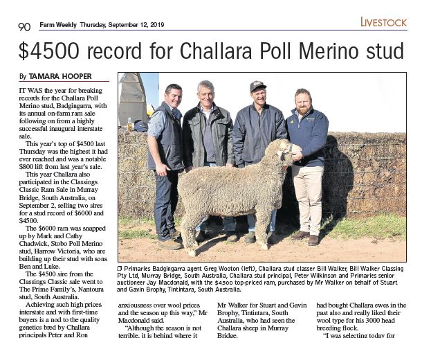 This year’s top of $4500 last Thursday was the highest it had ever reached and was a notable $800 lift from last year’s sale. This year Challara also participated in the Classings Classic Ram Sale in Murray Bridge, South Australia, on September 2, selling two sires for a stud record of $6000 and $4500.